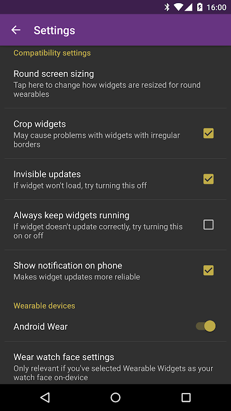 •一部の特定のウィジェットには、携帯電話がスリープ状態のときに更新されないものなど、一部の互換性の問題も知られています。これは私たちが修正できる問題ではありません-それはウィジェット自体の開発者次第です-しかし、あなたはhttp://wearablewidgets.com/widgets.htmlですべてのそのような問題のための緩和のヒントを見つけることができます