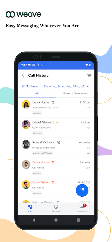 Weaveモバイルアプリは、お使いの診療管理ソフトウェア/EHR、そしてWeaveのオフィスアプリと同期しており、スマートフォンからシームレスに診療を管理するために必要なすべての情報とツールを提供します。非常に使いやすく便利で、スマートな働き方を実現します。