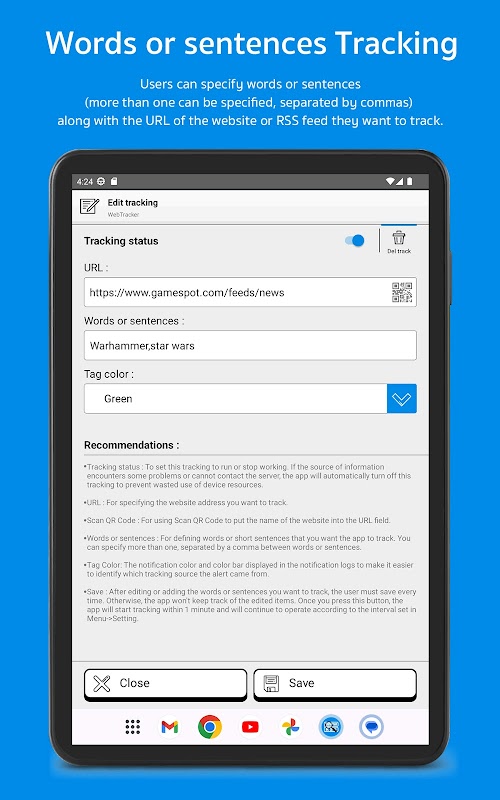 アプリの仕組み: 設定した Web サイトや RSS フィード上で指定した単語や文章をアプリが検出すると、すぐに通知します。誤って通知を無視した場合は、アプリ内で追跡ログを表示できます。アプリは同じニュースについて重複した通知を送信しないため、重複したアラートを受け取ることがなくなります。