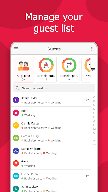 このアプリは、ゲストリストの管理に役立ちます。ゲストや同伴者を追加し、席次表を作成し、食事の選択や返信を管理して、あらゆるウェディングイベント(バチェロレッテパーティー、バチェラーパーティー、結婚式など)に対応できます。