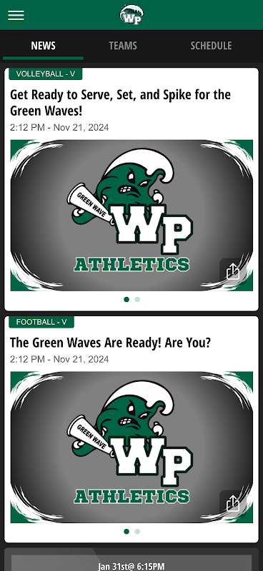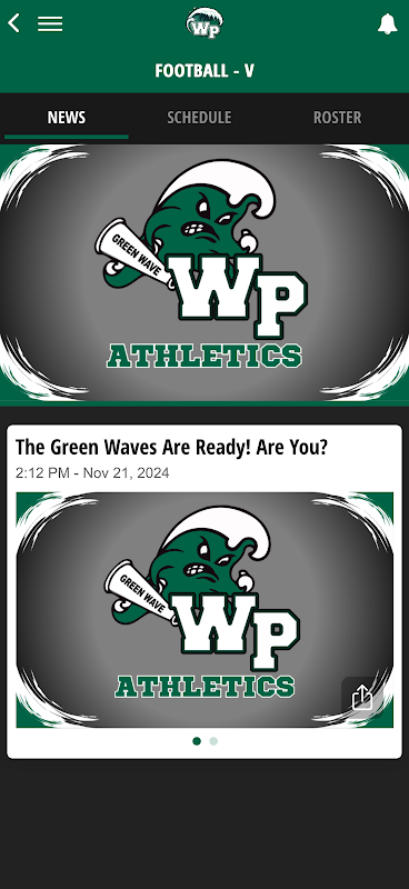 WP Green Wave アプリには、スコア、スケジュール、ニュース更新、名簿が備わっています。