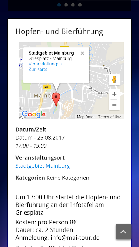 Diese App informiert Sie über alles was die Hallertau zu bieten hat. Im ständig aktualisierten Event-Kalender finden Sie Ausstellungen, Märkte, Sportveranstaltungen oder sonstige tagesaktuelle Freizeit-Tipps. Es beschränkt sich nicht nur auf den Bereich Tourismus und Sehenswertes, sondern bietet darüber hinaus umfangreiche Informationen zum Thema Übernachten, Ausgehen, Biergärten etc.