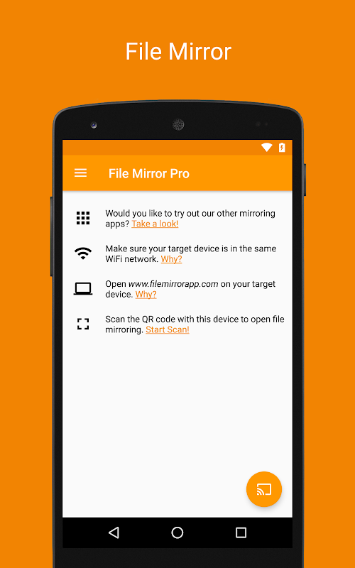 したがって、リモートデバイスでhttp://www.filemirrorapp.comを開き、Androidデバイスでファイル転送プロセスを開始し、QRコードをスキャンすると、ファイル転送がすぐに開始されます。それと同じくらい簡単です。ターゲットデバイスに追加のソフトウェアは必要ありません。