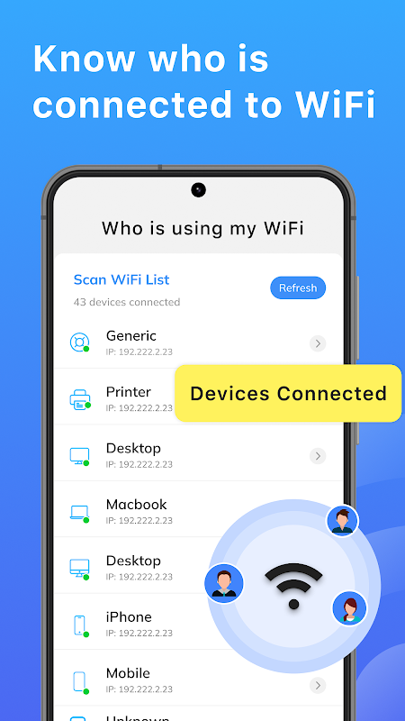 WiFi スキャナーとネットワーク スキャナー機能を使用して、WiFi マップ上に誰がいるかを検出します。誰があなたの WiFi を悪用しているのか気になりませんか?アプリのネットワーク スキャナーと WiFi スキャナー機能を使用すると、WiFi ネットワークに接続されているすべてのデバイスを視覚化し、承認されたデバイスのみが WiFi マップとネットワーク上に存在するようにできます。