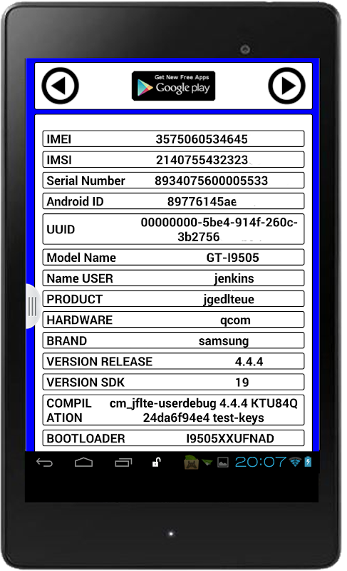 このアプリケーションは、あなたのスマートフォンの「ルート」であれば知っておくと便利であり、そのようなIMEI、シリアル番号、紛失や盗難の場合に非常に有用IDアンドロイドなどは、内部情報データを、示している。