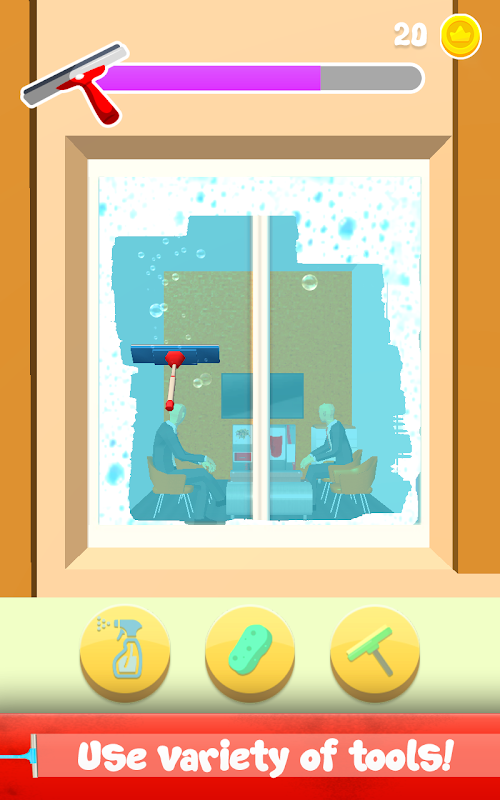 At the end of the level, if the window is cleared - the sound is made and vibration. A clean window appears and behind it, you can see what is happening in the office. Each level - a new action is shown in the office