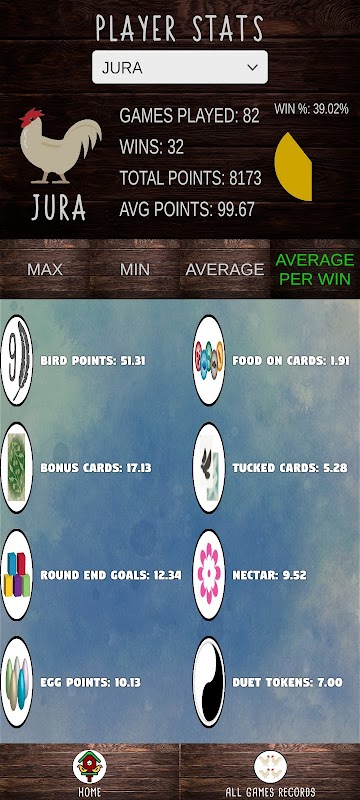 このアプリケーションの重要な部分は、ユーザーの実際のゲームから取得したさまざまな記録を追跡する機能でもあります。ユーザーは 2 種類のレコードを表示できます。「プレイヤーごと」の記録では、特定のプレイヤーの合計ポイント、勝利数、平均ポイントなどが表示され、「すべてのゲーム」の記録では、プレイしたすべてのゲームのトップスコア、ポイント、勝利数、勝率などが表示されます。