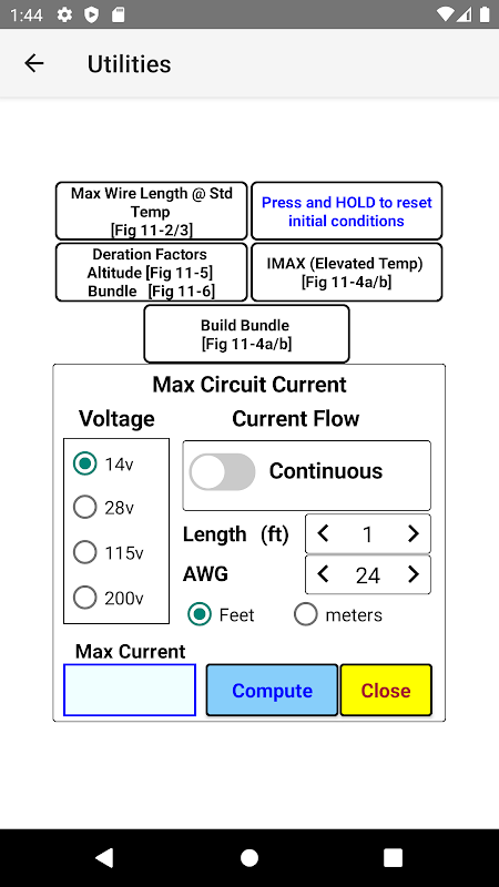 このアプリは、FAA Publication AC 43-13 1B (許容可能な方法、技術、慣行 - 航空機の検査と修理) に概説されている手順に従って、航空機 (A&P) 整備士が特定の条件に応じた正しいアメリカン ワイヤー ゲージ (AWG) ワイヤー サイズを決定するのに役立ちます。 )、第11章。
