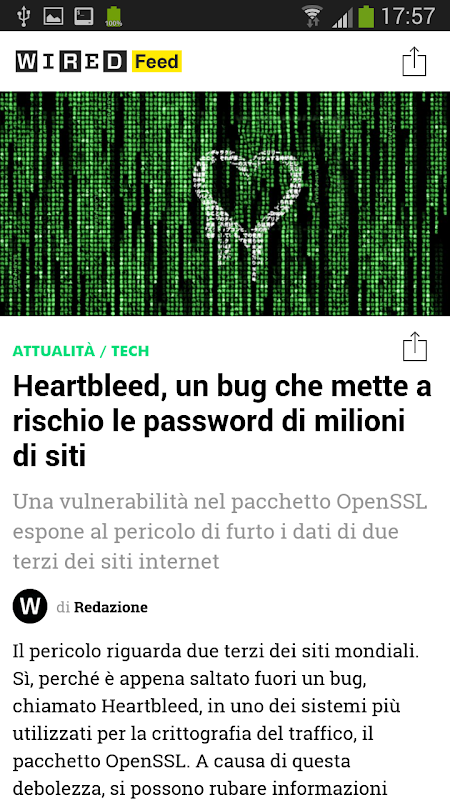 Con Wired Feed porti il mondo di Wired sempre con te in mobilità e personalizzi le tue notizie di attualità, internet, gadget, mobile, scienza, economia, lifestyle, giochi. E ancora le pillole di LOL, con tutte le news più curiose e i video più virali, e le riflessioni di Idee.