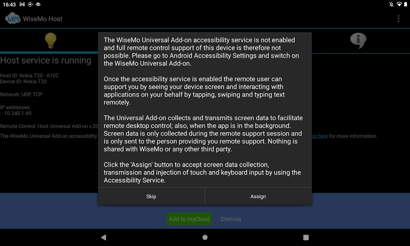 アプリはアクセシビリティ API を使用して画面データを収集し、認証されたゲスト ユーザーと共有します。このアドオンをインストールした後、デバイスの Android アクセシビリティ設定を通じてアドオンを有効にする必要があります。
