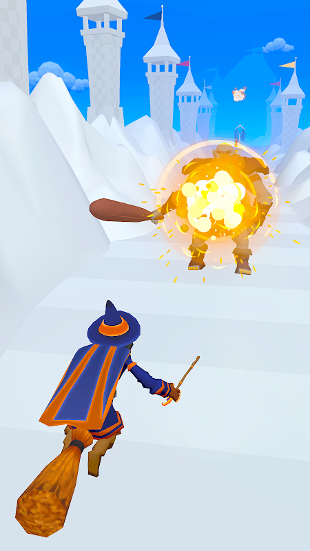 これは、ほうきで飛ぶ魔法使いのシンプルなゲームです。私たちの仕事は、目標に到達し、対戦相手を排除することです。私たちは杖で武装しているため、敵を攻撃し、火の玉から身を守ることができます。間違った呪文を唱えると損失になる可能性があるため、それほど簡単ではありません。だから、用心深く、あなたはあなたの目標を達成するでしょう!