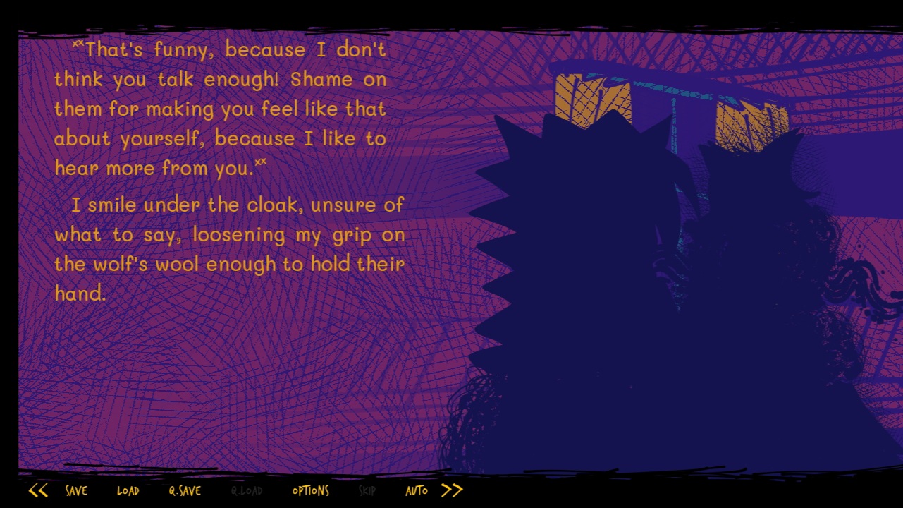 Wolf's Wool は、育った社会から脱出した後、崩壊しつつある覆いの下に何があるのか不思議に思う抽象的なビジュアルノベルです。