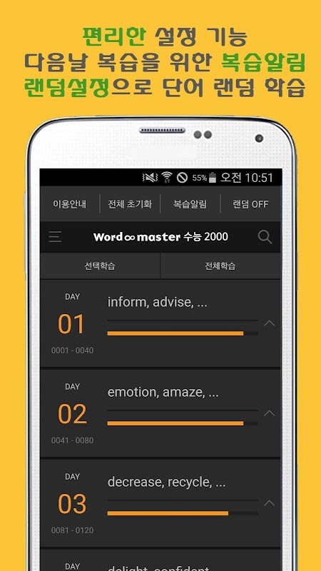 단어테스트에서 틀린 단어를 "다음날" 복습알림을 통해 내가 원하는 시간에 복습테스트를 할 수 있습니다. 또한 랜덤설정으로 단어를 랜덤 순서로 학습할 수 있습니다.