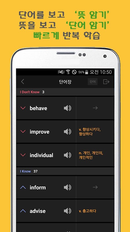 워드마스터에 특화된 단어 암기장! 단어카드의 학습 결과에 따라 ‘I don’t Know’와 ‘I Know’로 구분된 단어에 대한 심화 학습이 가능합니다. 단어를 보고 뜻을 암기하거나 뜻을 보고 단어를 암기할 수 있습니다.