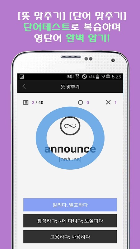 4. 뜻 맞추기/단어 맞추기 : 암기한 단어는 단어테스트를 통해 확인하고 복습할 수 있습니다.