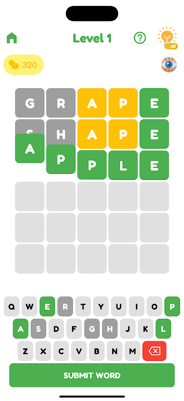 5文字の単語を6回で当てよう!コインを獲得し、ヒントを使って先へ進みましょう。