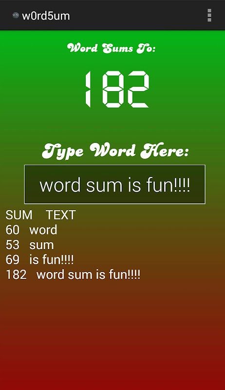 今までワードの値が何であるか疑問に思いましたか?すべてのアルファベットの文字、A = 1、Z = 26に数値を割り当てることにより、w0rd5umは、あなたの言葉の値を計算します!右あなたの非常に目の前に!