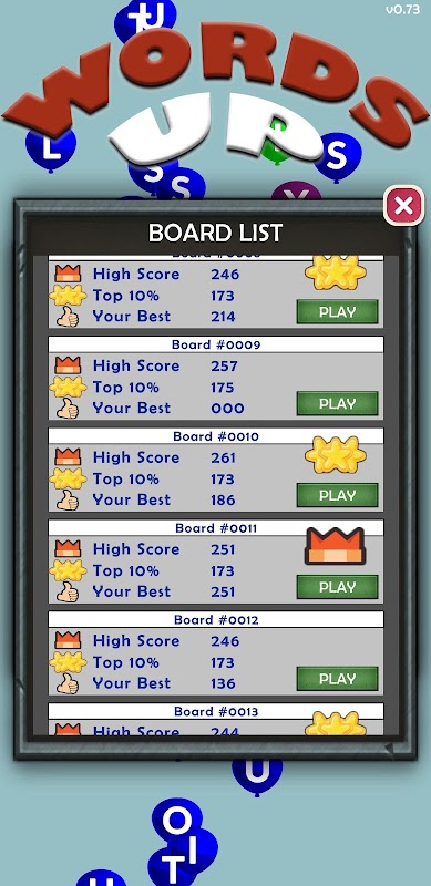 Words Up is a fun and challenging match-3 game where you find 4 (or more ) letter words in a letter grid. Each game board will have the same starting grid giving you the chance to find the best opening moves to propel yourself up the world rankings!