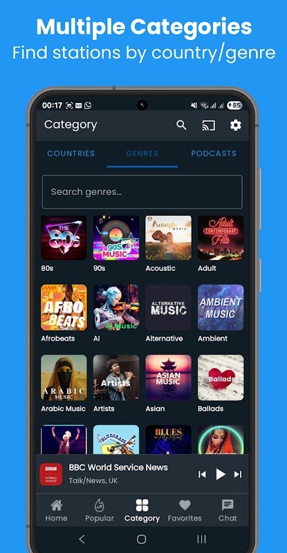 世界中のすべての国を網羅しています。新しいラジオ局は毎日追加。聴きたい局をタップするだけで、途切れることなく再生が始まります。