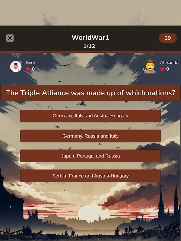🎮? 友達に挑戦:仲間を集めたり、激しいリアルタイムマルチプレイヤークイズで世界中のプレイヤーと対決したりできます。第一次世界大戦の歴史であなたの専門知識を証明しながら、戦略を立て、競争し、支配してください。