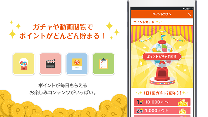 ポイントガチャ、動画、チラシ、アンケートなど毎日手軽にポイントが貯められるコンテンツが盛りだくさん!