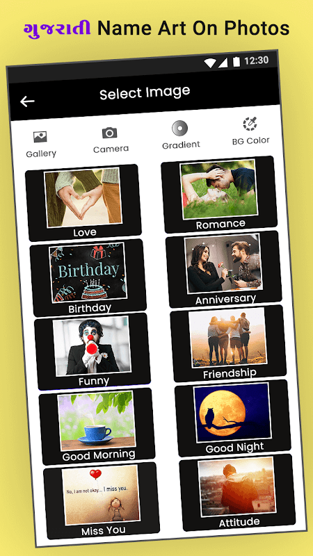 Write Gujarati Text on photo app allows you to add various Gujarati text and write Gujarati poetry on photo from your gallery or camera, also select from huge collection of HD Background like love, romance, birthday, anniversary, good morning, good night, friendship etc.