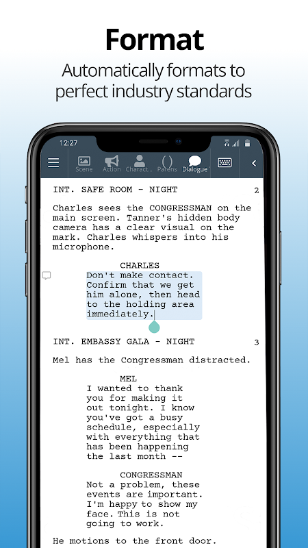 WriterDuetは業界標準のフォーマットを自動的に処理するため、最も重要なこと、つまりストーリーの作成に集中できます。