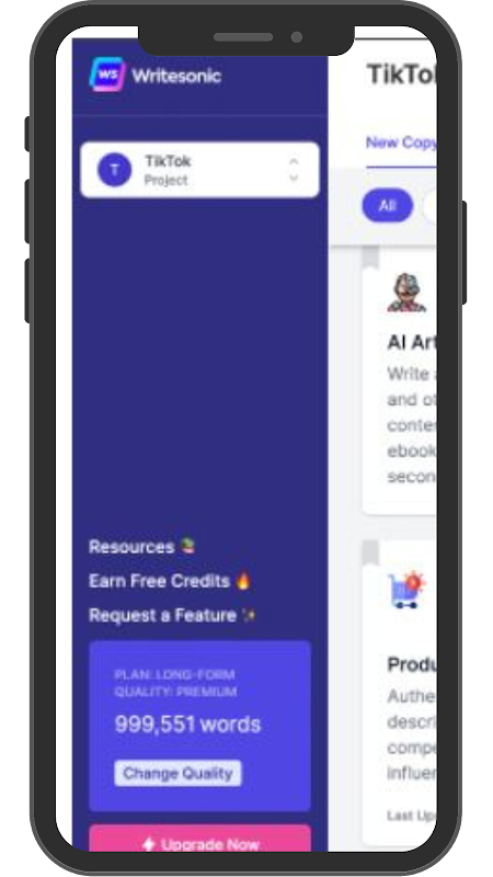 一般に、この Writesonic アプリ ガイドは、次の 5 つの機能に分かれています。