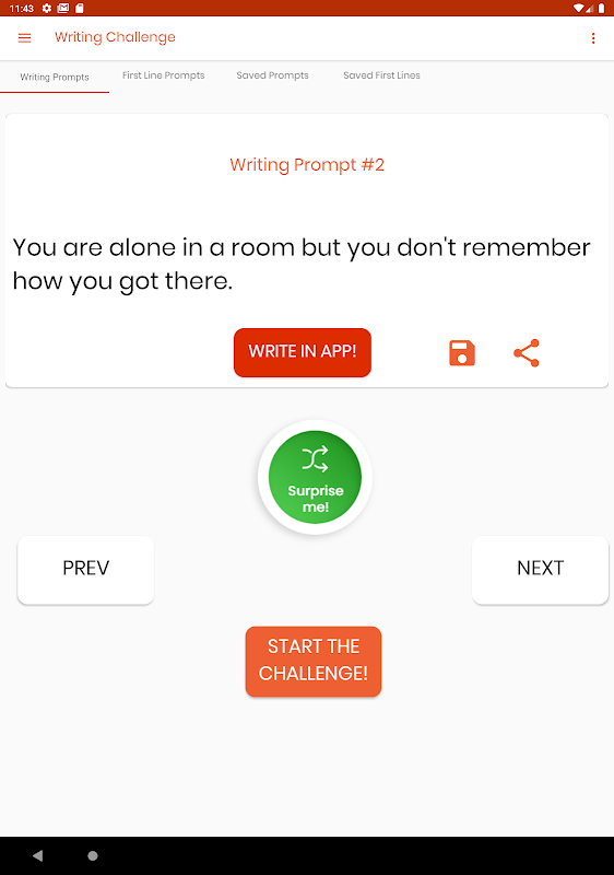 サプライズミー:どのライティングプロンプトを選択するか決められませんか?非常に多くの選択肢があるため、決定が難しくなる可能性があることはわかっています。 「Surprise Me!」という素晴らしいボタンがあります。それを押すだけで、ランダムなプロンプトが表示されます。それが今すぐ書き始めるためのあなたのプロンプトです!