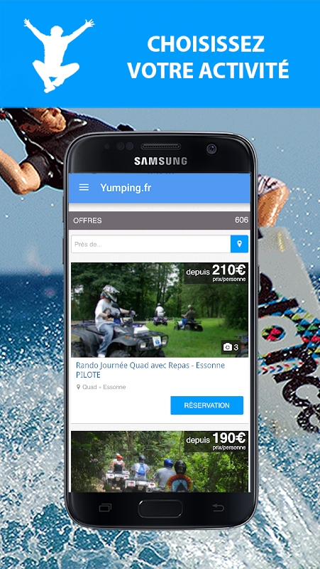 Yumpingはフランスで9,000以上のアドベンチャー・アクティビティを提供しています。あなたは、チェックを呼び出すか、あなたのAndroid携帯電話やタブレットから容易かつ確実に予約することができます。どこにいても、あなたはいつでもあなたは完璧な活動を見つけます!ダイビング、ゴーカート、乗馬、ペイントボール、スキー、ジェットスキー、キャンプ、スカイダイビング、飛行機の飛行、サーフィン、大腿四頭筋、ガイド付きツアー、ハイキングや、より多くの...