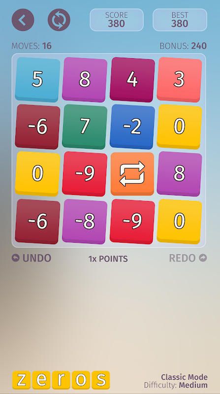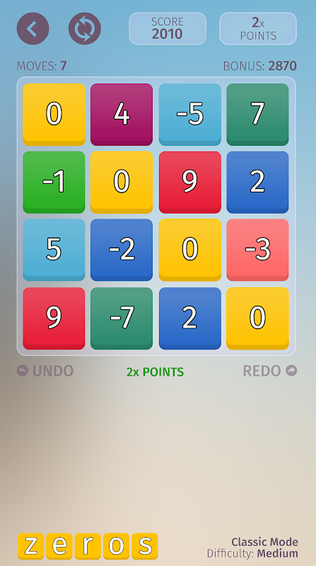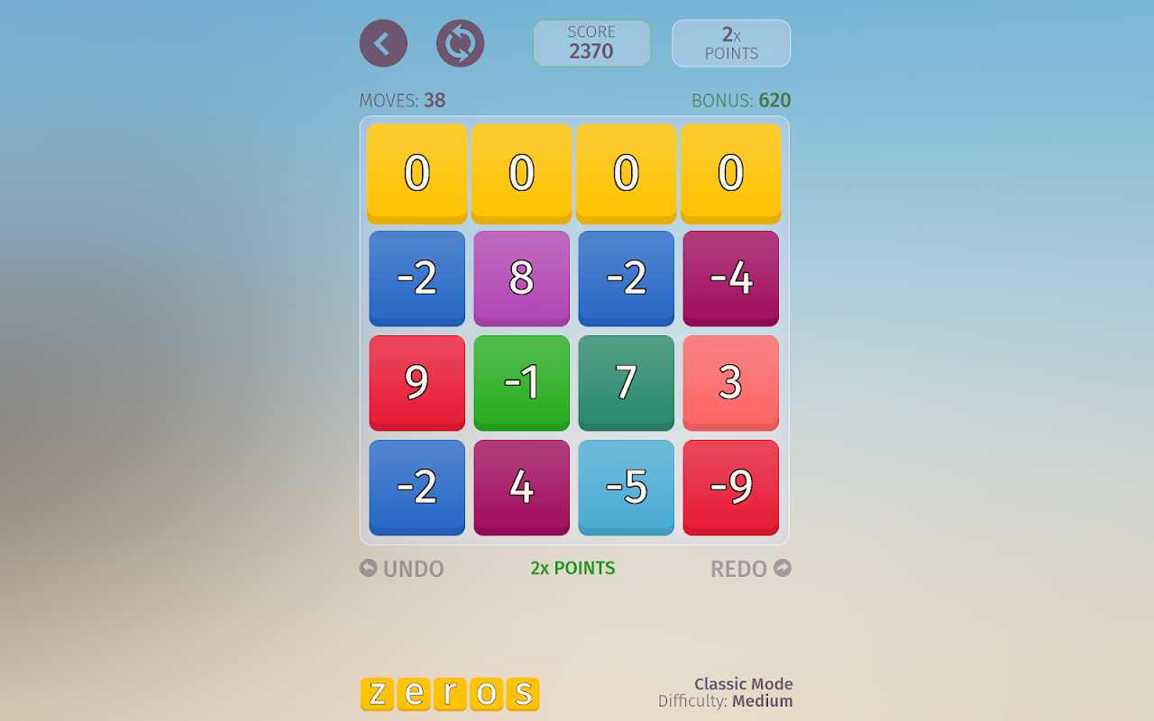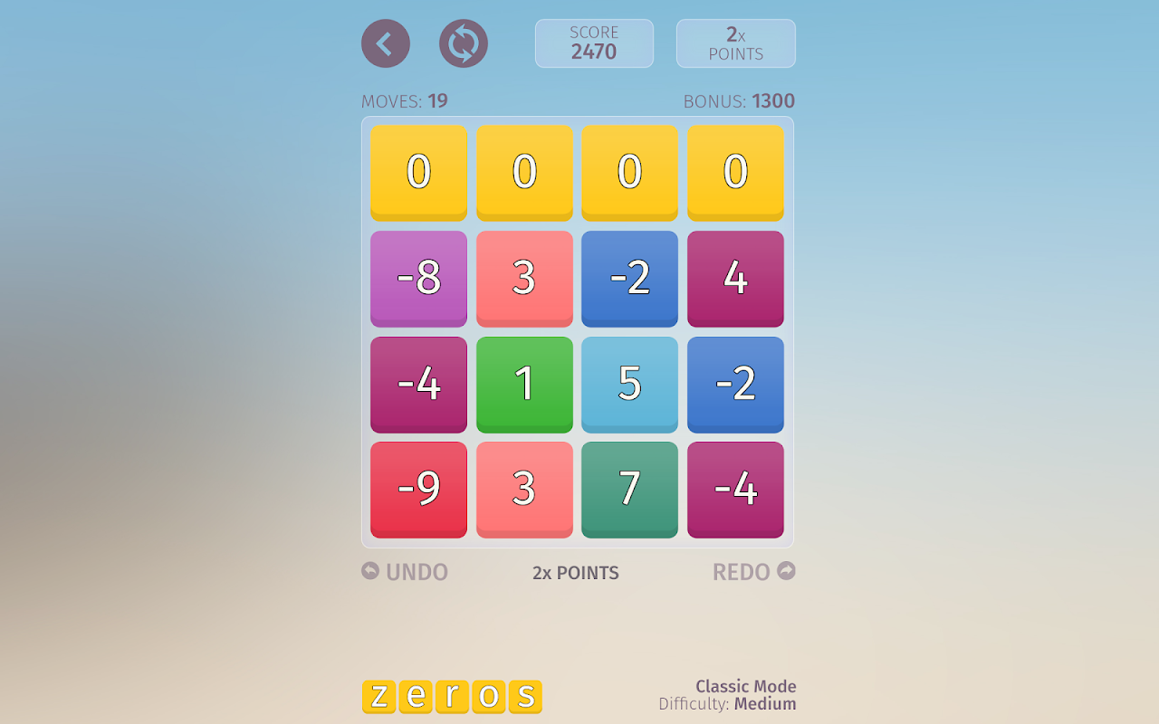 Zeros is a fun and challenging puzzle: Move blocks to perform addition. But be careful, blocks can't go over 9 or below -9. Connect 4 zeros to level up. Magic blocks will help you along the way.