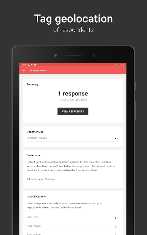 信頼性の低いインターネットは、問題を解決する可能性があります。長い読み込み時間がないと、調査リンクを共有して回答を収集できない場合があります。このアプリはその問題を解決します。インターネットに接続しなくても、いつでもどこでも応答を収集できます。