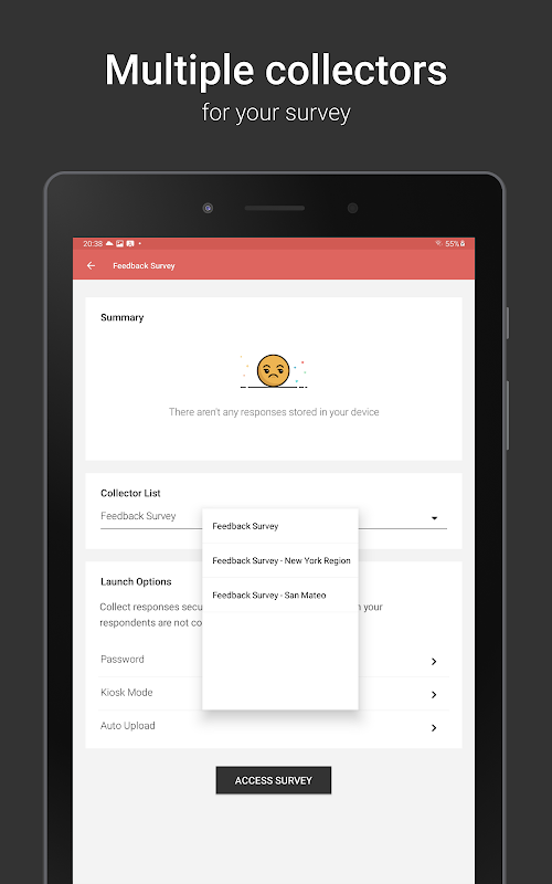 リストからアンケートを選択し、接続の問題を気にせずにタブレットで回答の収集を開始します。オフライン収集は、見本市、フィールドセールス訪問、チェックアウトカウンター、モールキオスク、および人々を調査する必要があるその他の場所でフィードバックを収集するのに最適です。