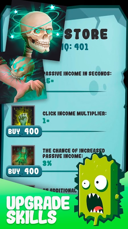 ゾンビをクリックすると、IQポイントを増やすチャンスがあります。また、クリックパラメータを改善してクリックごとのIQをさらに高めたり、より多くのポイントを獲得するチャンスを増やしたりすることもできます。異なるゾンビをクリックすると、獲得できるポイント数が異なります。進化の連鎖に沿って進むにつれて、クリックで獲得できるポイント数は膨大になります。