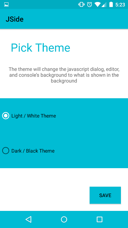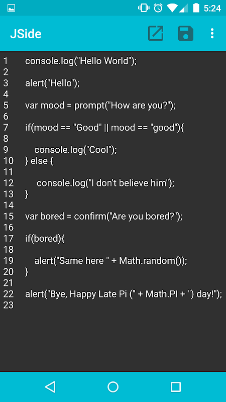 JSide is a Javascript IDE app offering a built-in editor, launcher, and console. The launcher runs the script and the console shows the logs from messages to errors. JSide has a nice modern design that can be changed between Dark / Black Theme and Light / White Theme but this doesn't change JSide's calming primary cyan color. JSide allows you to save your script locally and soon online. It also allows you to share your code. Moreover, if you have any file you need to edit you can go ahead and open it through the app. In addition, it has a line count as many other editors.