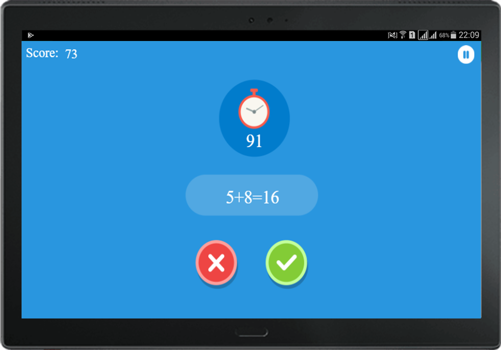 La aplicación consiste en que dada una operación deberás responder si esta "Correcta" o "Incorrecta" con un tiempo cada vez más limitado ¡Lograr tu mejor puntuación!