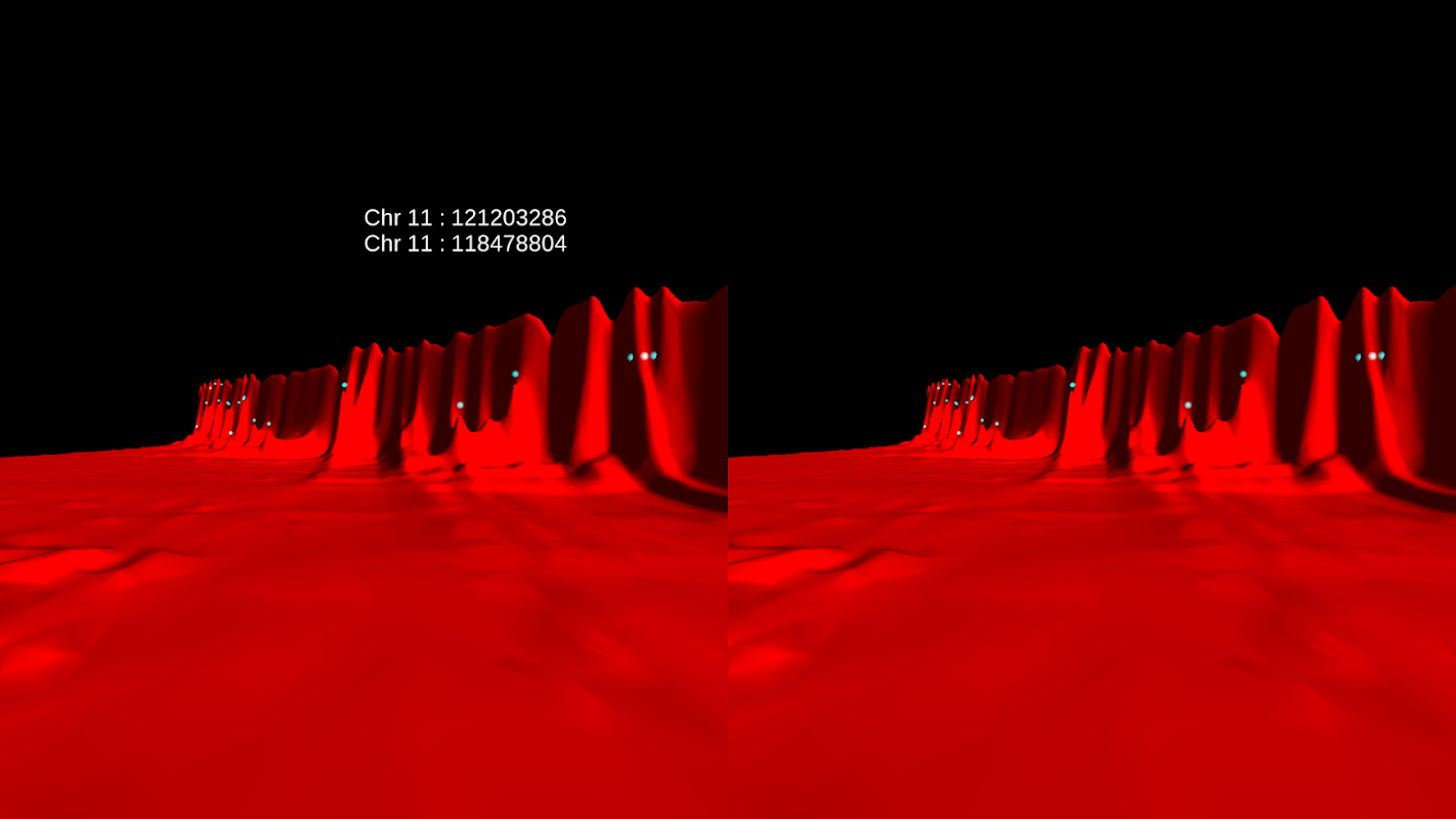 Juicebox VR creates a virtual reality representation of data generated by the Hi-C method for three-dimensional genome sequencing. Every 2D position in the landscape corresponds to a pair of 1D positions, or loci, in the three-billion-letter-long human genome. The height at the 2D position represents how often the two loci are in contact in the nucleus of a cell.