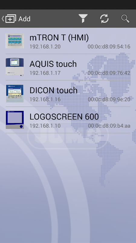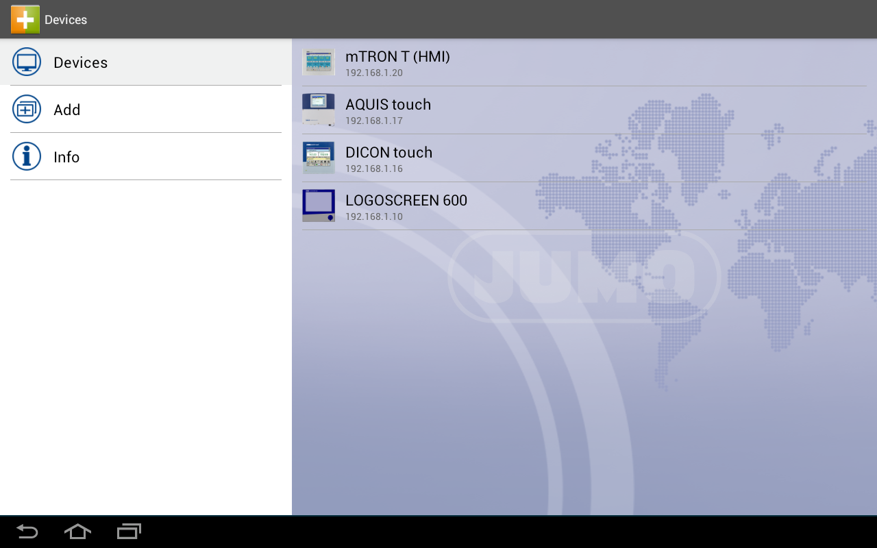 The free JUMO Device app allows smartphones and tablets to communicate with the paperless recorder JUMO LOGOSCREEN 600. The app can scan for devices in the company network and displays the discovered devices in an easy-to-read list. Users can select the device either from this list or do so manually by entering the IP address / DNS designation. If a JUMO device is selected via the app, the device tells the app which data it can provide. This data could, for example, include current measured values, events, or alarms.