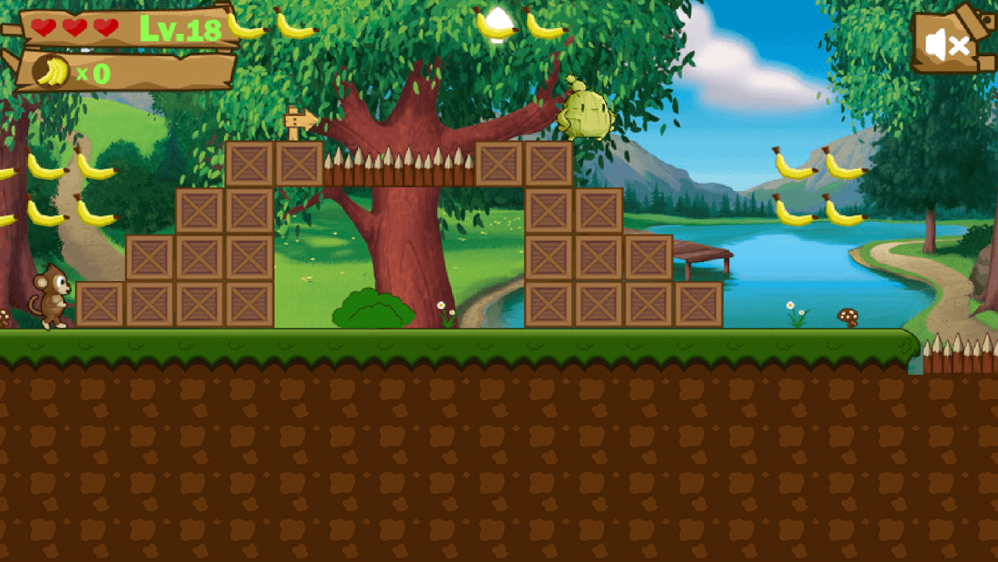 The small monkey is very hungry.So he is finding food in the jungle.But the jungle is very large and danger.Some monsters are in the jungle.Your task is helping the monkey running out of the jungle and collect more bananas.