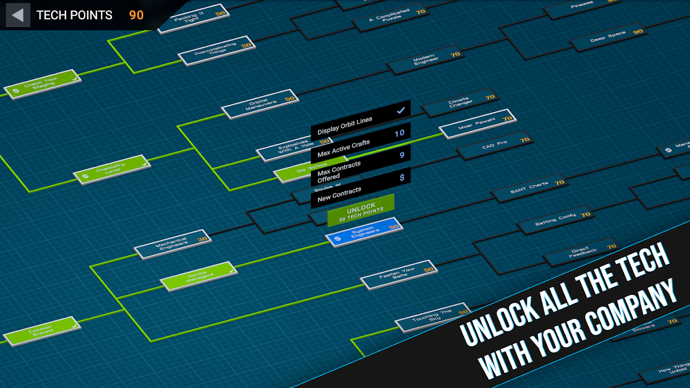 Take control of your own aerospace company and earn money and tech points as you progress through the game. Complete contracts to earn money, and discover a mixture of hand-crafted and procedural contracts that offer countless hours of new gameplay. Conquer milestones and explore landmarks to earn tech points and unlock new technology in the tech tree. Interactive tutorials are available to show how to build and operate rockets, cars, and airplanes.