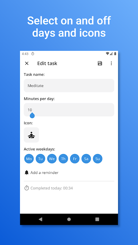 Set daily, manageable time goals for habits and tasks and use the countdown timer to complete them. View your statistics for past days.