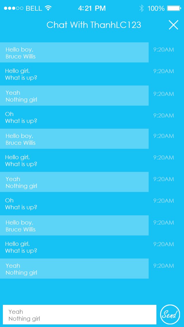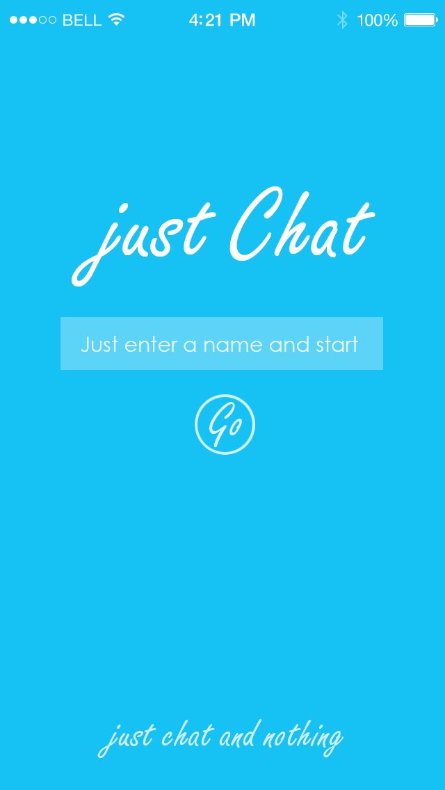 Just Chat - is an application for anyone who wants to chat, tell, discuss or confide with any strange person else something about his/her secrets that he/she doesn't want anybody to know . With this application, user needs to open and enter any name, pick anyone in the list chat and start chatting with them. Once the chat is end, users can quit out the application and feel secure because this application has a perfect way to clear out all conversations and nothing is stored in the app.