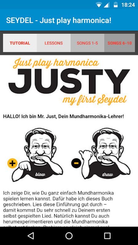 The JUSTY app offers 15 video lessons for (exercises and ten full songs). The unique teaching system with JUSTY as your conductor makes it very easy to learn to play on the harmonica. You will need a good internet connection to use this app.