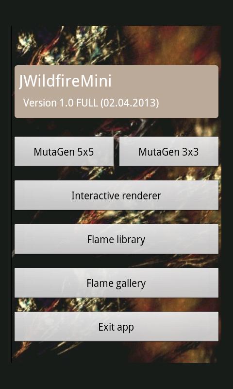 It comes with both the fractal evolution module "MutaG" and the interactive renderer "IR", as known from the full JWildfire application, to your Android-capable device!