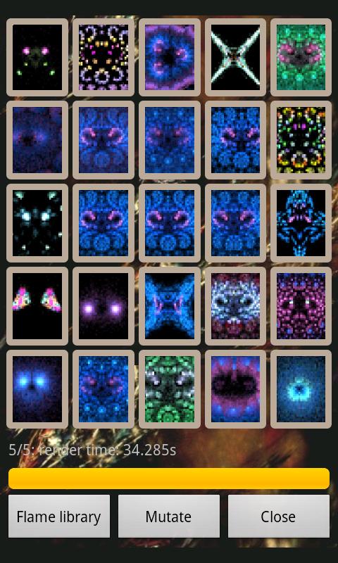 With this app you will be able to create unique flame fractals by playing with the MutaG module. You can start with modifying one of 60 the stunning flame fractals which are included, and then later continue to modify your own creations. Share your renderings with your friends and amaze your girlfriend with an unique valentine fractal!