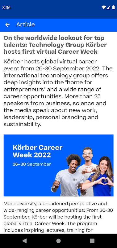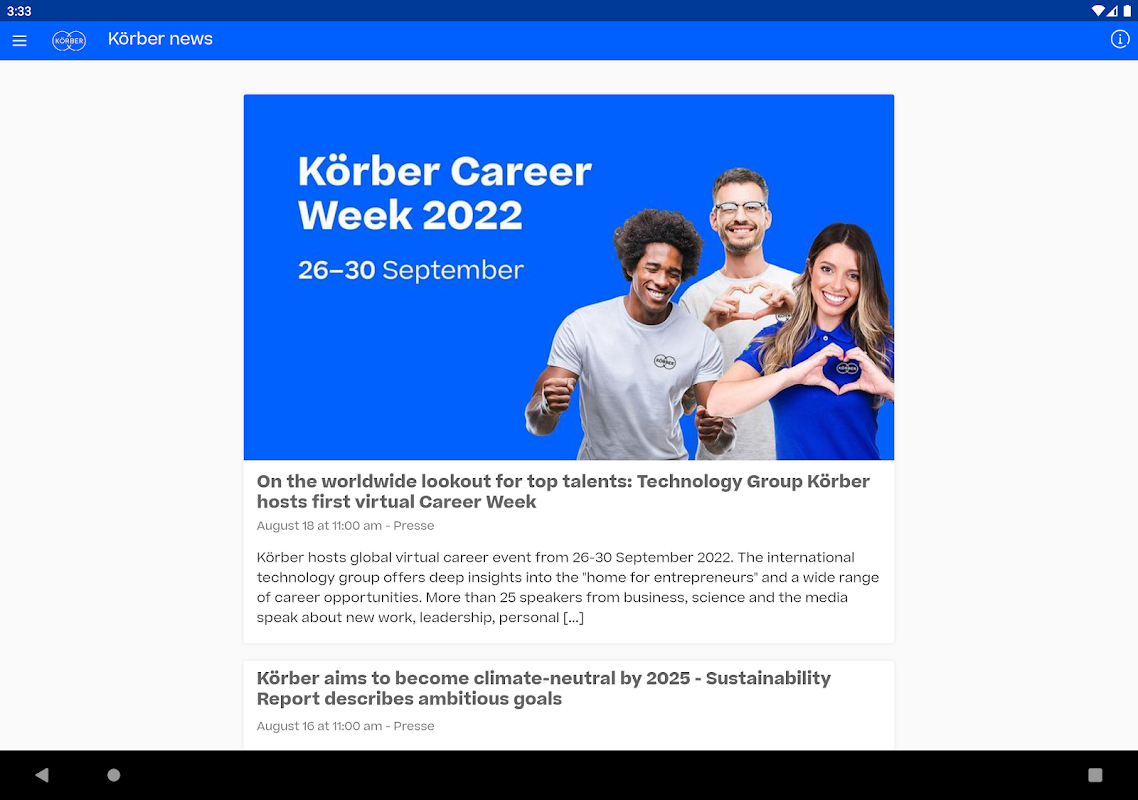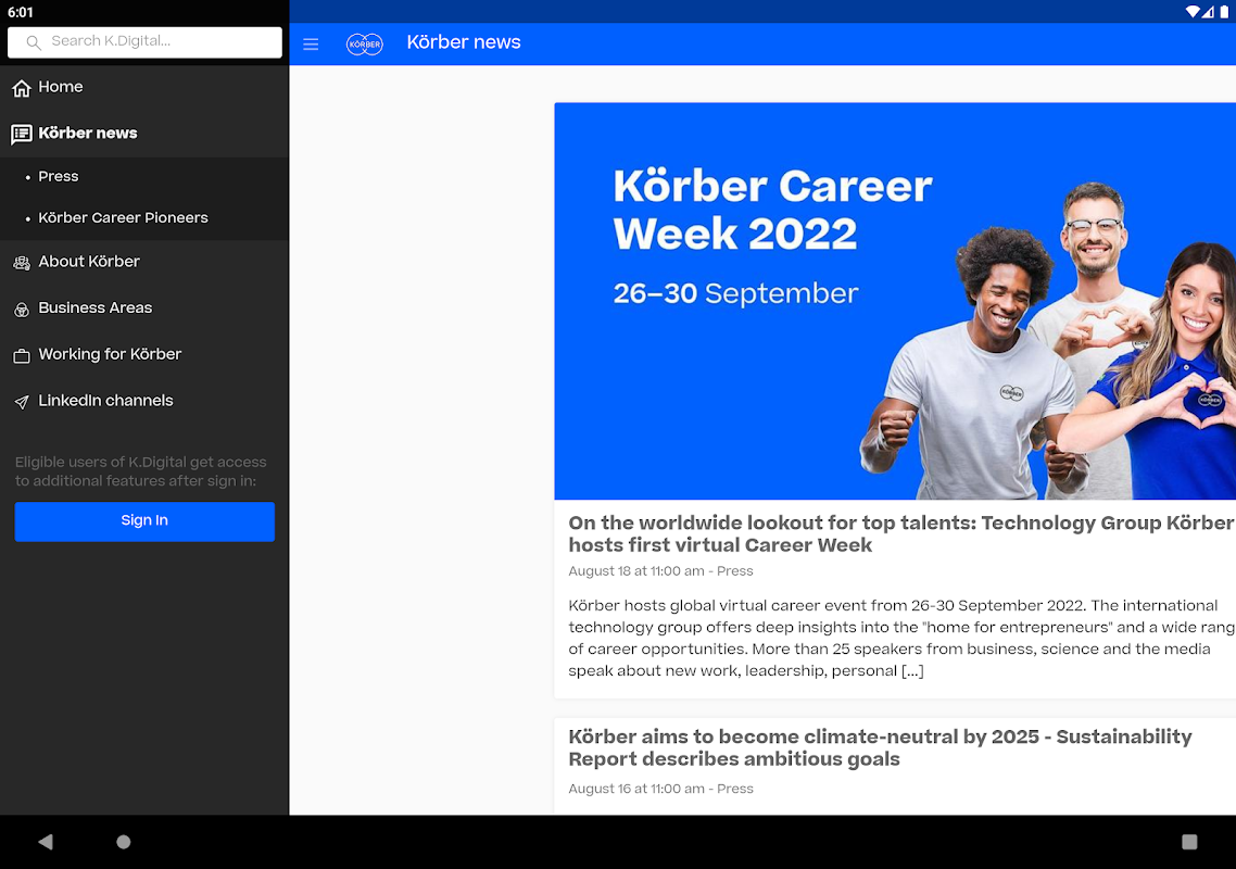 "K.Digital" news app is the Körber Group's central news and communications app and the best way to stay up to date. Körber is an international technology group. In five business areas, Körber experts translate entrepreneurial thinking into customer success and shape technological change worldwide.