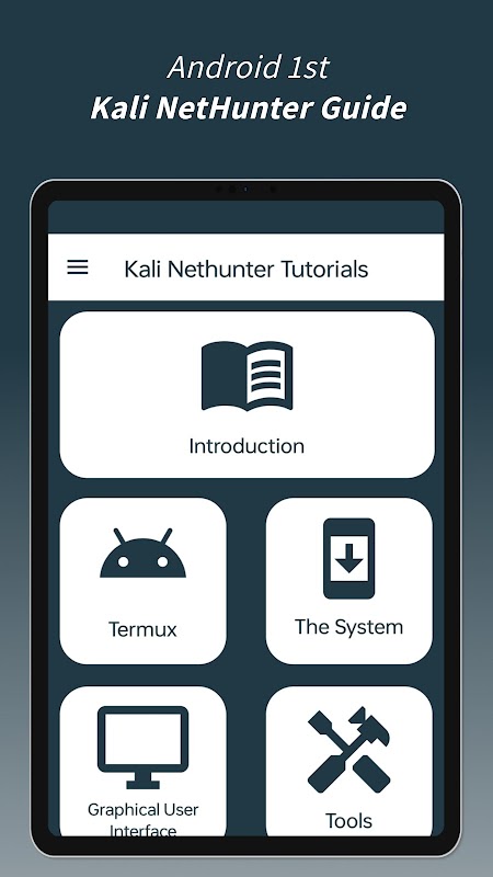 The lessons are organized into different sections within the app, which are constantly updated to keep up with developments on Kali NetHunter. These sections include: