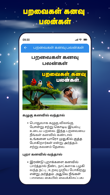 The Kanavu Palangal app - கனவு பலன்கள் offers a compilation of dreams and their associated benefits, all presented in the Tamil language. It offers a collection of dream meanings, categorized for easy browsing.
