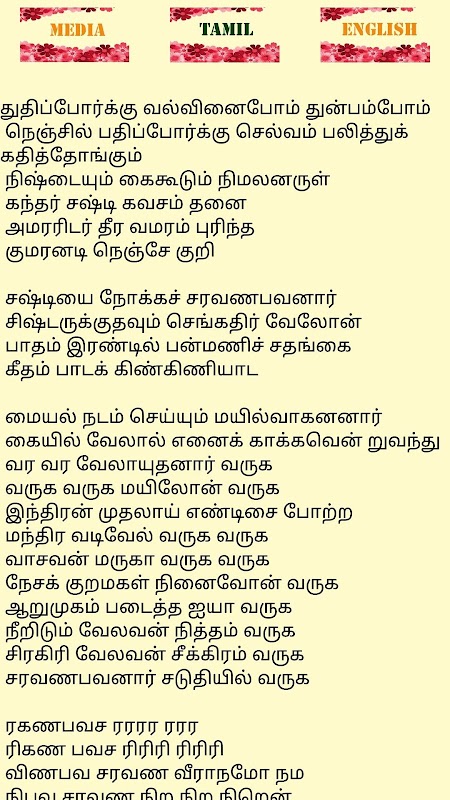 Kanda Sashti Kavasam (Tamil: கந்த சஷ்டி கவசம்) is a song composed in Tamil by Devaraya Swamigal. This app gives you a divine experience listening to the sashti kavasam. It has the following features: