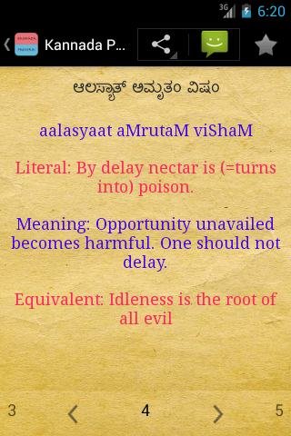 "Kannada Proverbs" is a simple Android application which contains commonly used Kannada proverbs popularly defined as short expressions of popular wisdom. The wisdom is in the form of a general observation about the world or a bit of advice, sometimes more nearly an attitude toward a situation.